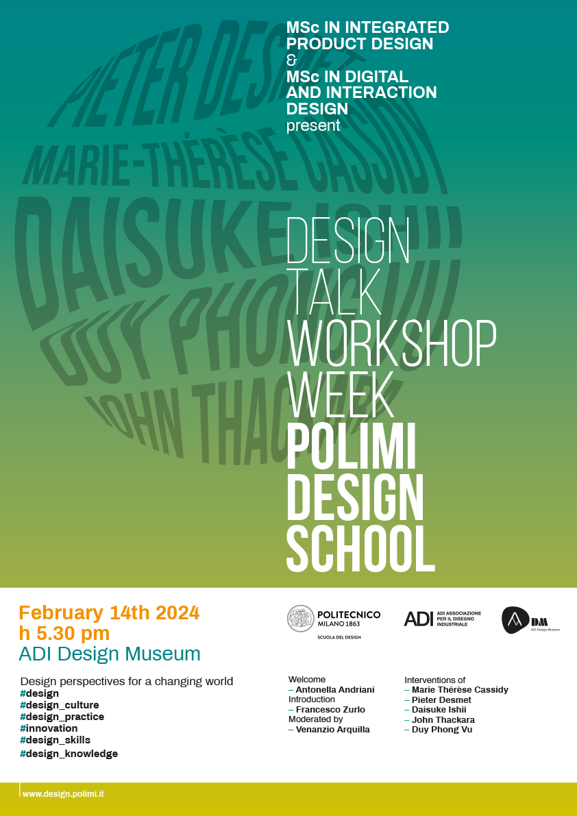 Every year, the School of Design of the Politecnico di Milano organises a workshop week for students on cutting-edge topics, in which design culture becomes a matrix for connecting other cultures and disciplines. In February 2024, five groups of international lecturers will be guests of the Master’s Degree Courses in Integrated Product Design and Digital Interaction Design and will lead as many workshops as possible. In this 2024 edition, the workshops will be held by international teams of designers and researchers, coordinated by: