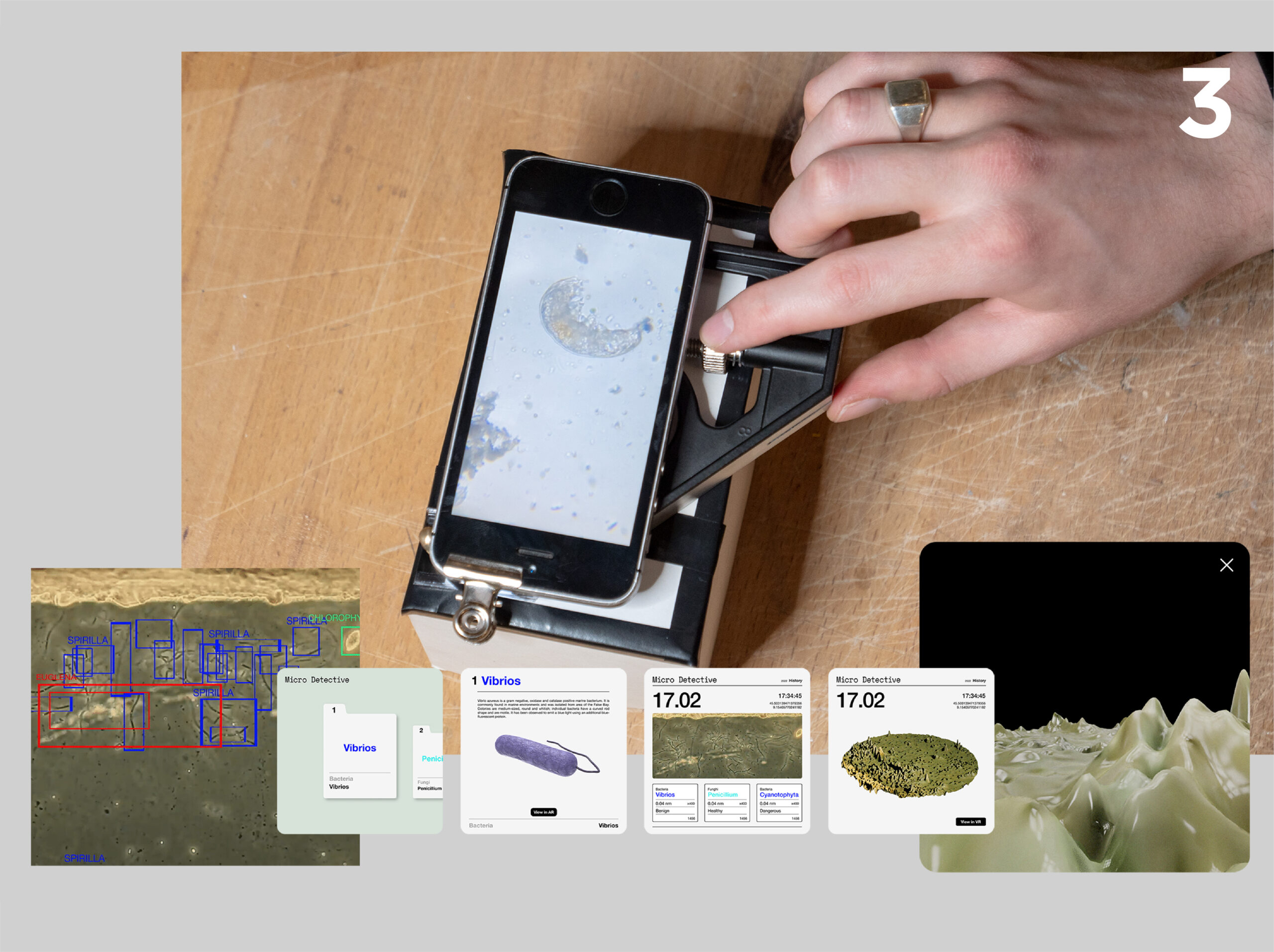 Simple DIY construction of a makeshift microscope encourages urbanites to collect and observe microbial samples. An app records the microscope sessions, with AI included in to recognize and classify the observed species. Finally, translation of microscopic data allows diving into the microbial sample in an immersive VR experience.