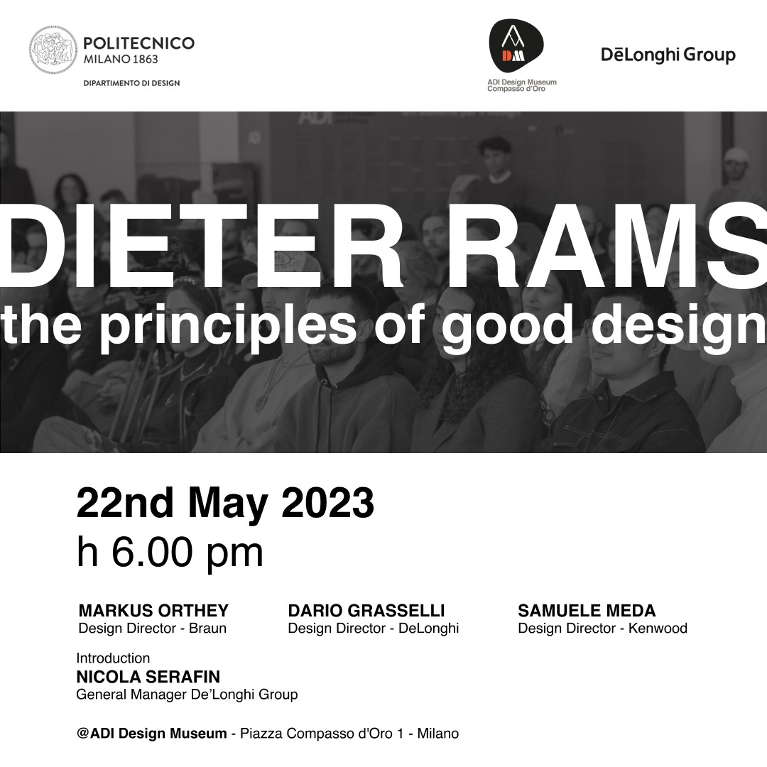 During the exhibition “DIETER RAMS _ A glance at the past and the future”, which will be held at the ADI Design Museum from 4 May to 11 June 2023, with the contribution of the DeLonghi Group, the School of Design of Politecnico di Milano is organising several collateral events to help visitors discover Dieter Rams and the principles of Good Design.